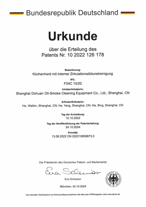 热量祝贺上海多环公司内循环式油烟净化灶体技术获得德国发明专利